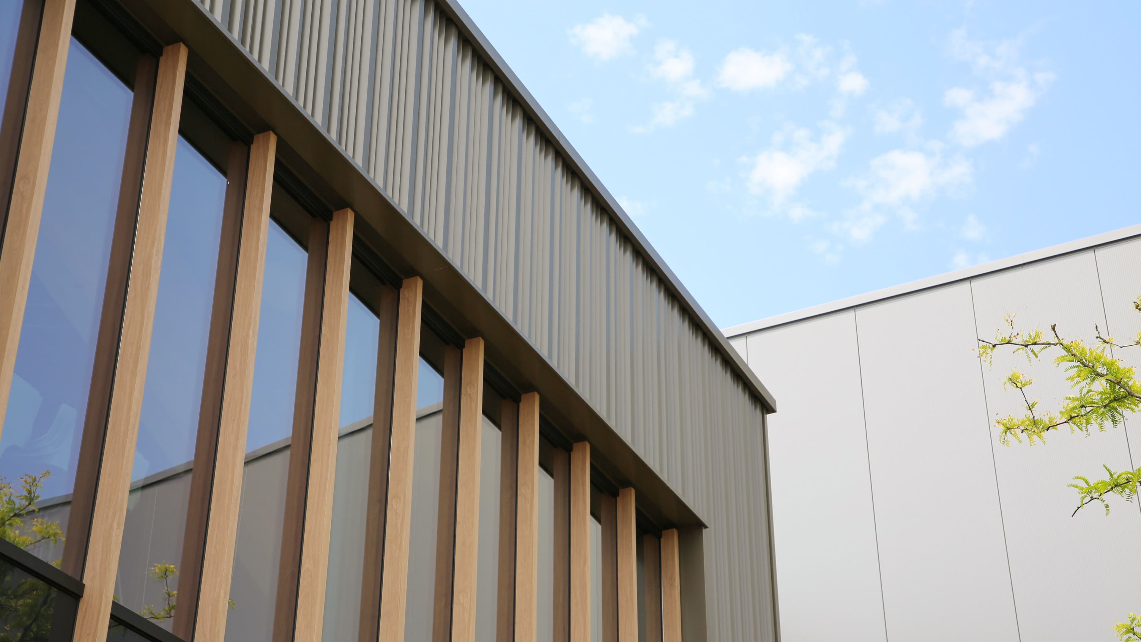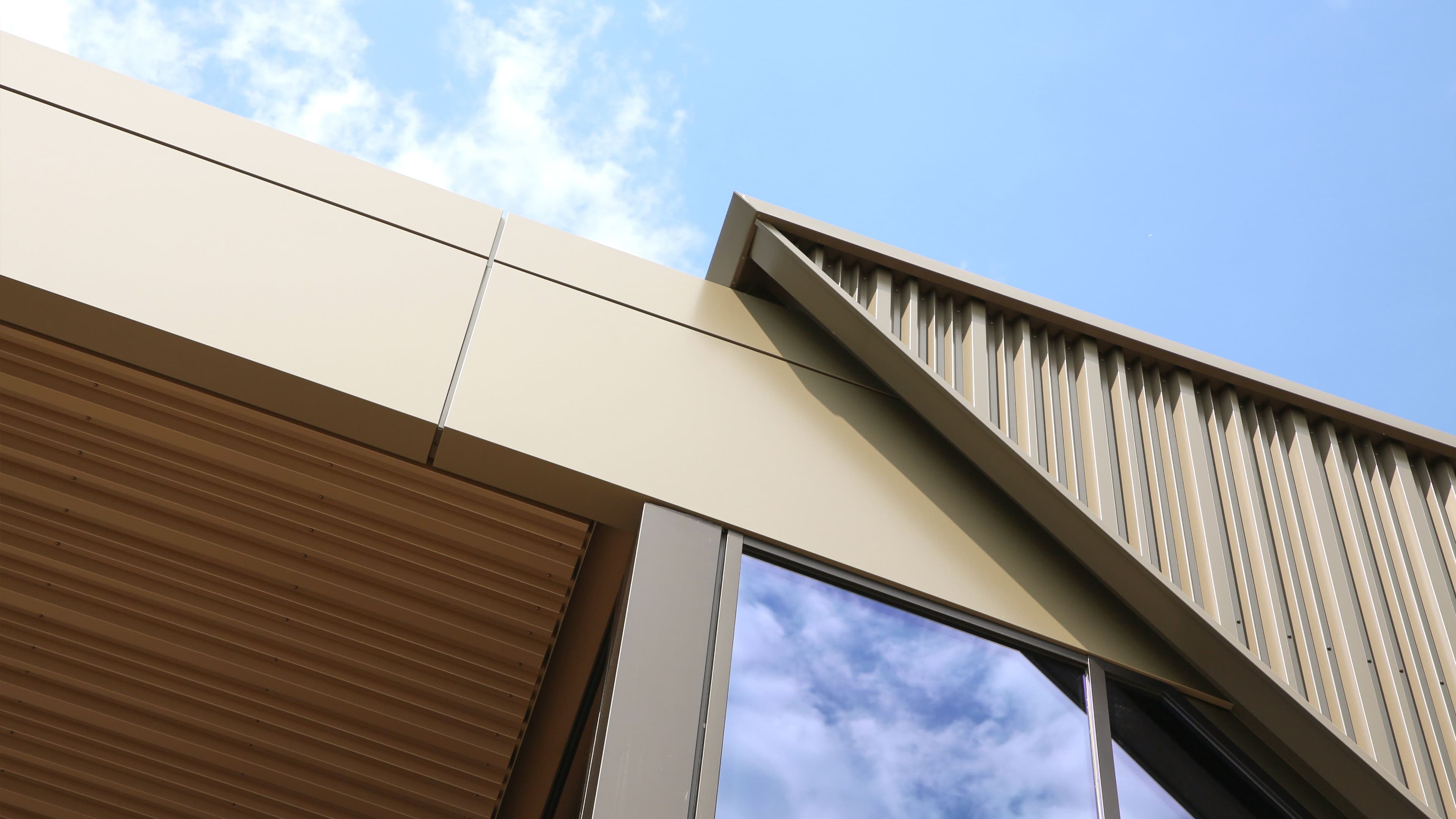 Blikvanger van het pand is de toepassing van FALK Cadence designprofielen, in kleur Ephyra. Deze 400 m² profielplaten vormen samen met 185 m² aluminium composiet van Cofac een krachtig visueel statement. De composietdelen zijn verlijmd op een aluminium achterconstructie en gemonteerd met precisie tot op de millimeter. Deze combinatie maakt het pand een voorbeeld van modern geveldesign.